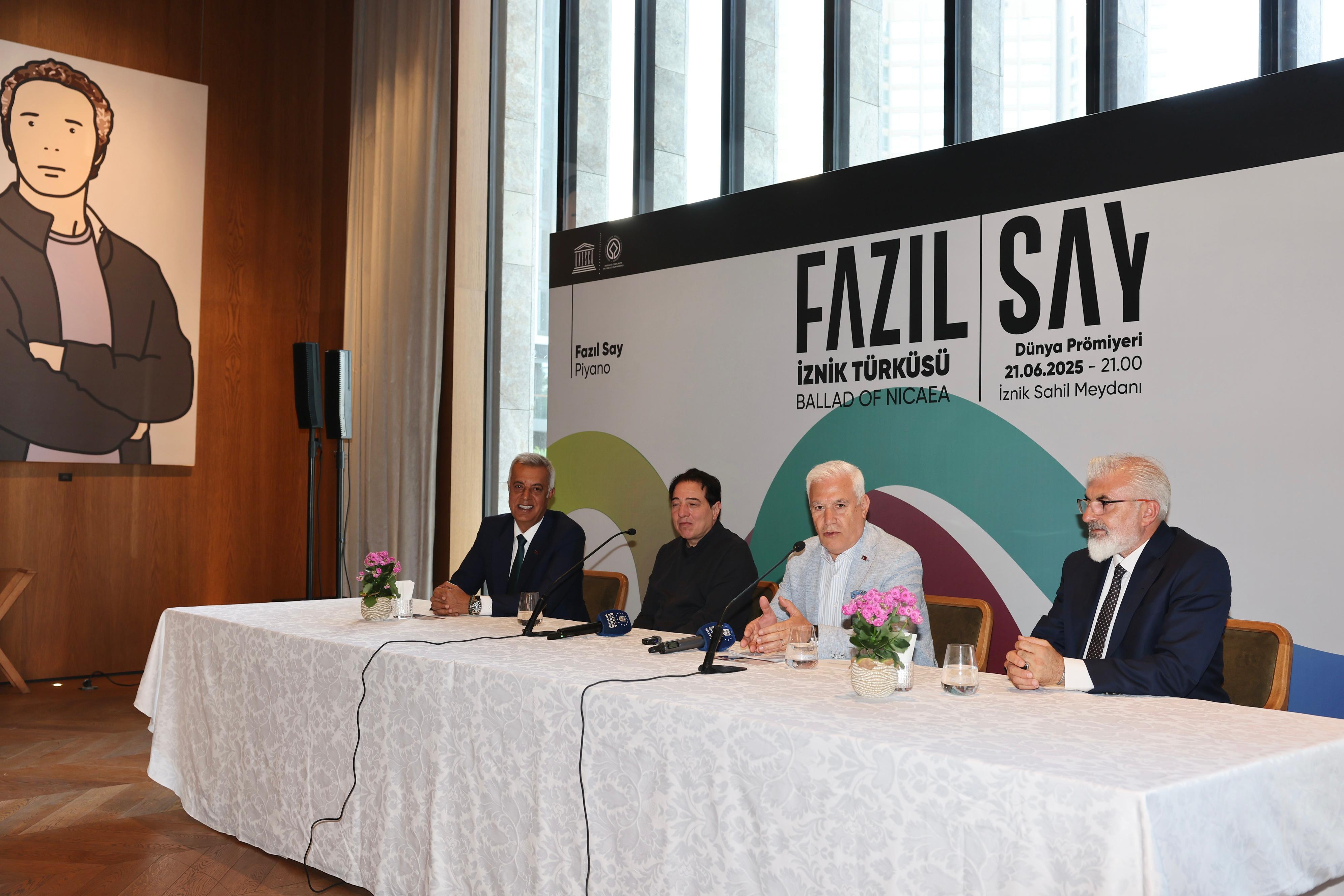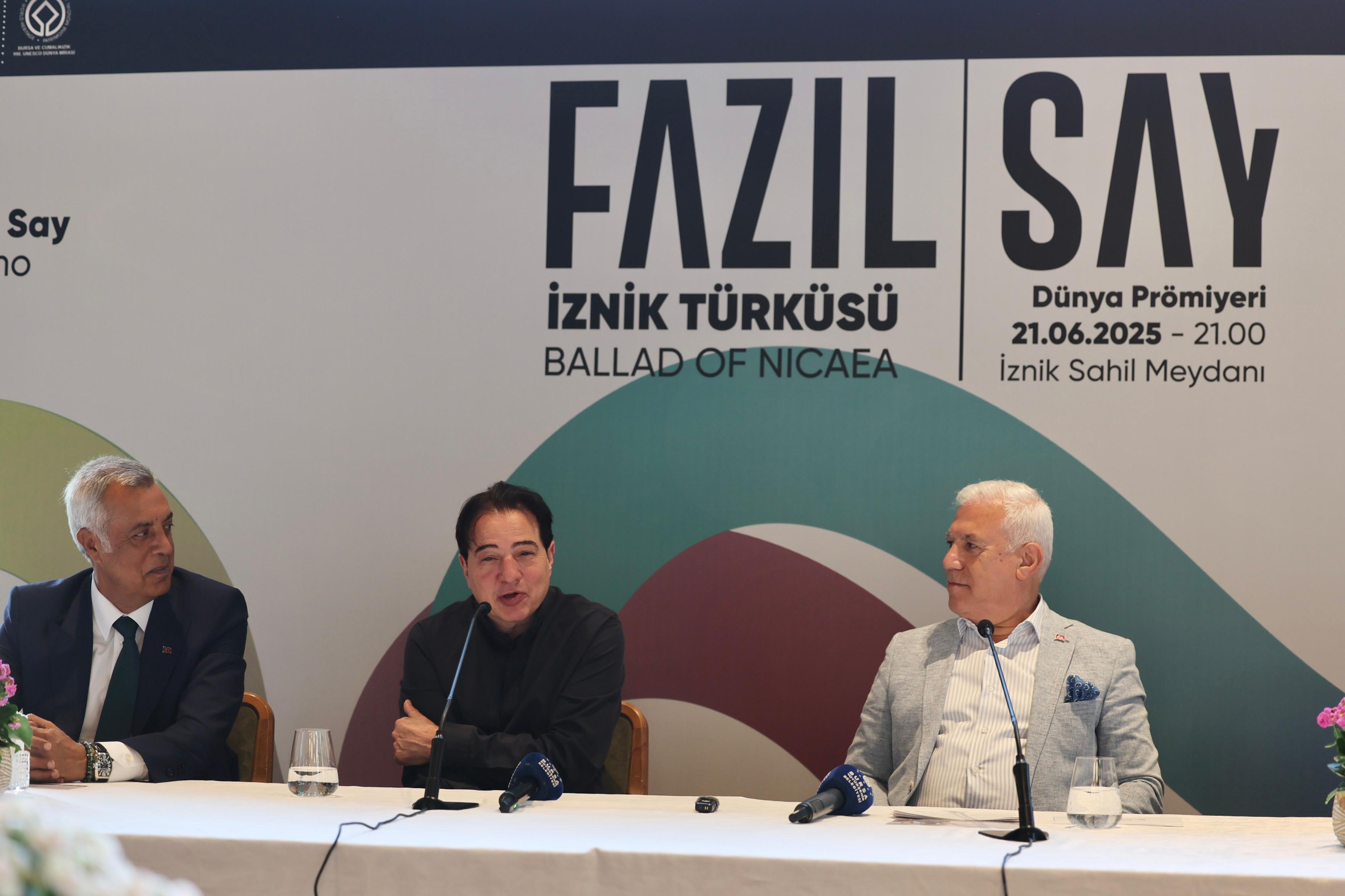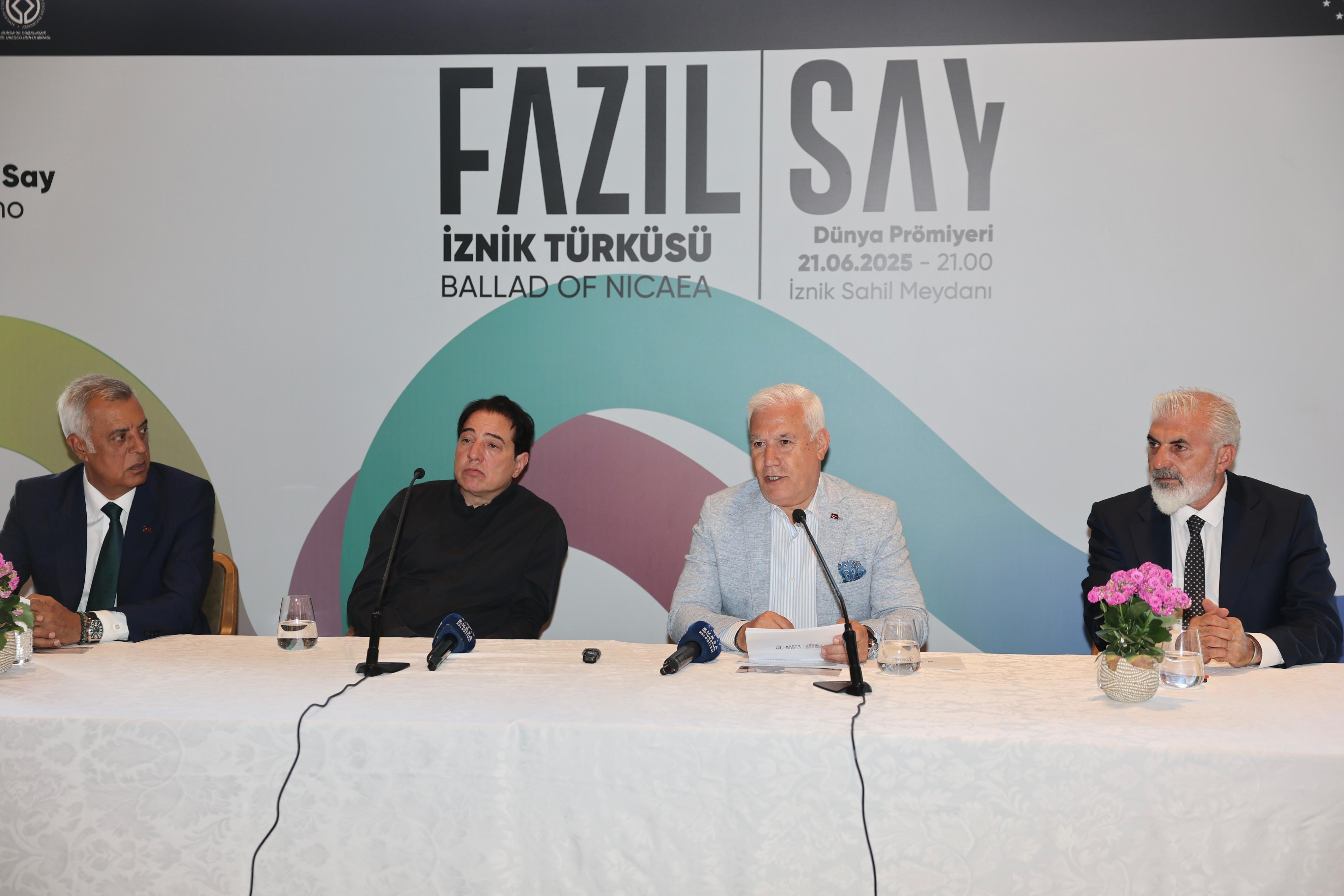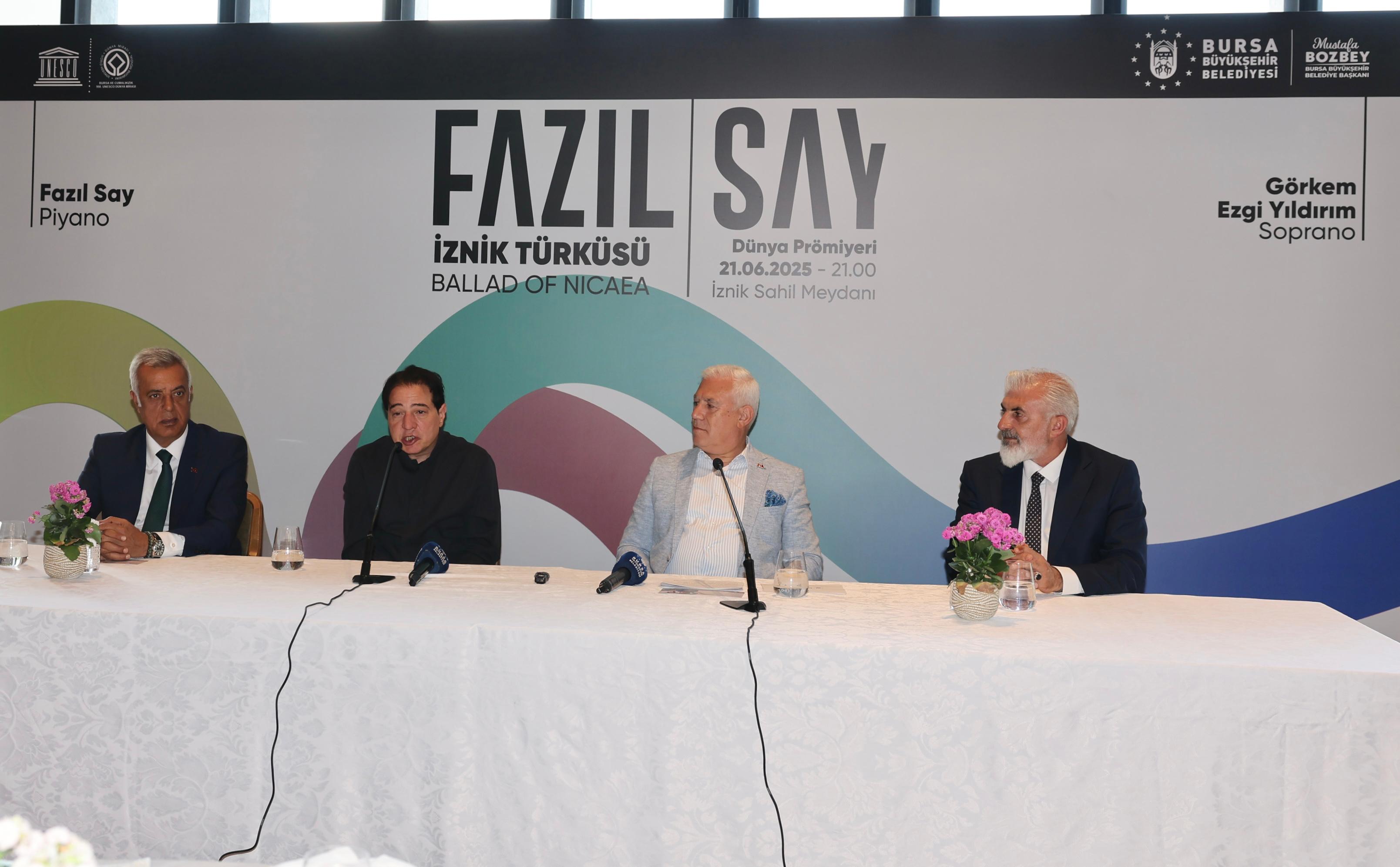 Ünlü piyanist ve besteci Fazıl Say ise konuşmasında İznik’in tarihsel önemine dikkat çekti. Antik dönemlerden Bizans’a, Selçuklu’dan Osmanlı’ya kadar birçok medeniyete ev sahipliği yapan İznik’in, aynı zamanda Birinci Konsil gibi önemli olaylara sahne olduğunu hatırlattı. Say, “İznik bir dünya mirası. Bu kültürel mirası anlatmak için sadece turizm tanıtımı yetmez; kalıcı eserler de gerekir. Ben de bu düşünceyle, Bursa Büyükşehir Belediyesi’nin davetiyle İznik’in hikayesini müzikle anlatmayı amaçladım” dedi.