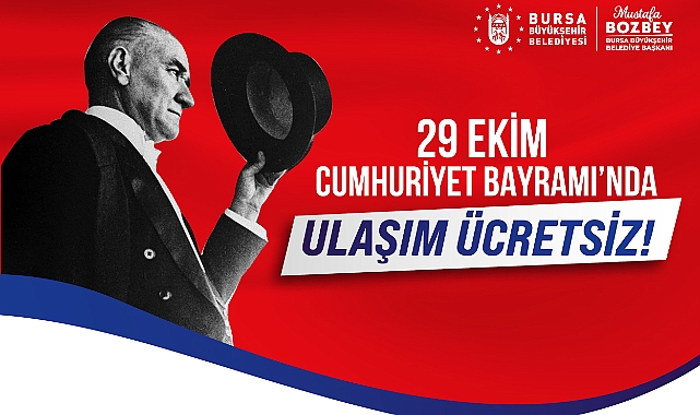 Bursa Büyükşehir Belediyesi, Cumhuriyet Bayramı kutlama ve etkinliklerinin coşkulu kalabalıklarla yapılabilmesi için BursaRay, tramvay hatları ve otobüslerde 29 Ekim Salı günü ulaşımın ücretsiz olacağını açıkladı. Ücretsiz uygulamadan yararlanmak için vatandaşların Bursakart’larını kullanmaları gerekirken, uygulama kent içi yolcu taşınan hatlarda geçerli olacak.
