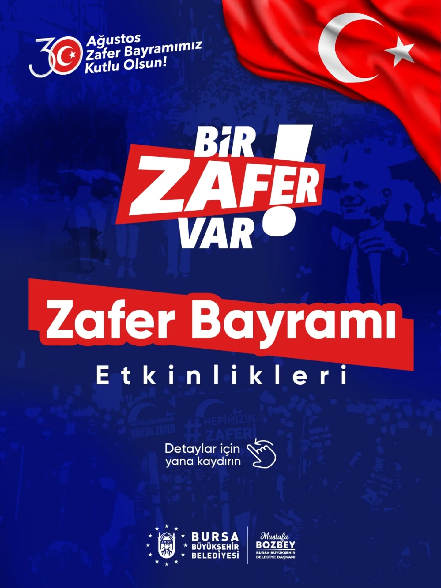 Bursa Büyükşehir Belediye Başkanı Mustafa Bozbey, tüm vatandaşların 30 Ağustos Zafer Bayramı’nı kutlayarak, Bursalıları 3 gün boyunca sürecek etkinliklere katılmaya davet etti.