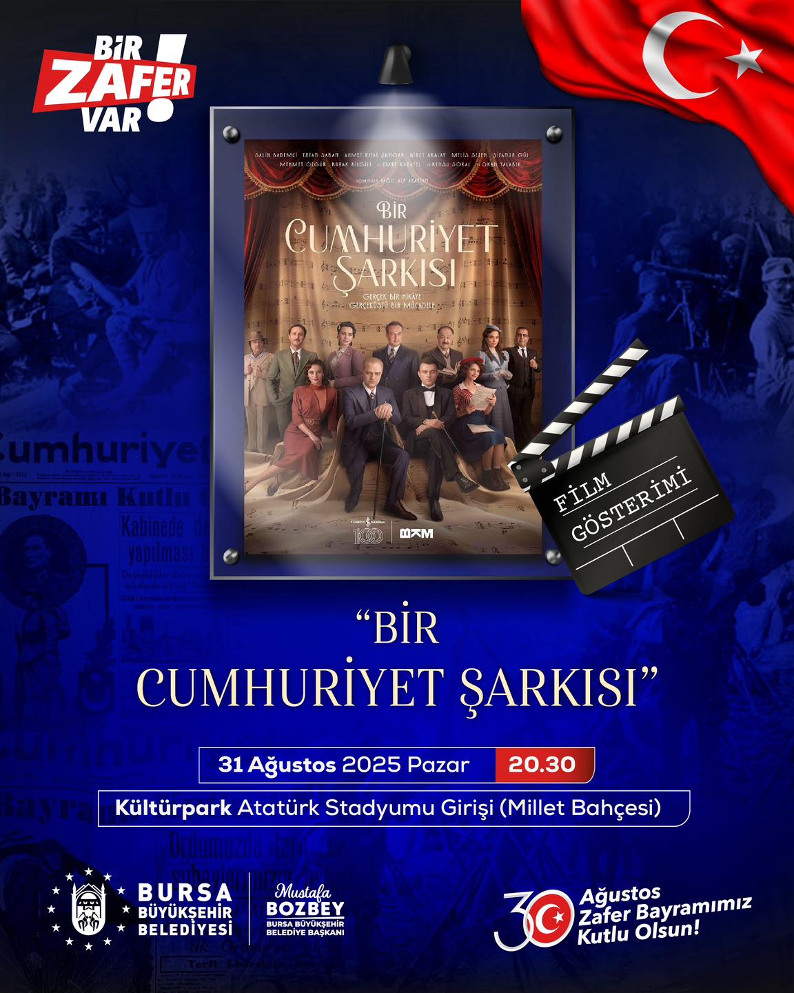 30 Ağustos Cumartesi günü ise saat 12.00’de UNESCO Meydanı’nda ’30 Ağustos Bursa’da Zaferin Hafızası’ segisi, saat 15.00’de Uludağ Üniversitesi Metro İstasyonu’nda ‘Bir Zafer Var’ fotoğraf sergisi izlenime sunulacak. ’30 Ağustos Zafer Yürüyüşü’ ise saat 20.00’de Bursa Büyükşehir Belediyesi Tarihi Belediye Binası önünden başlayarak Kültürpark Atatürk Stadyumu girişine (Millet Bahçesi) kadar sürecek. Nâzım Hikmet’in Kuvâyi Milliye Destanı’nın okunacağı Millet Bahçesi’nde, sevilen sanatçı Göksel’in sahne almasıyla coşku doruğa çıkacak. 31 Ağustos Pazar günü ise saat 20.30’da Kültürpark Atatürk Stadyumu girişinde ‘Bir Cumhuriyet Şarkısı’ film gösterimi yapılacak.