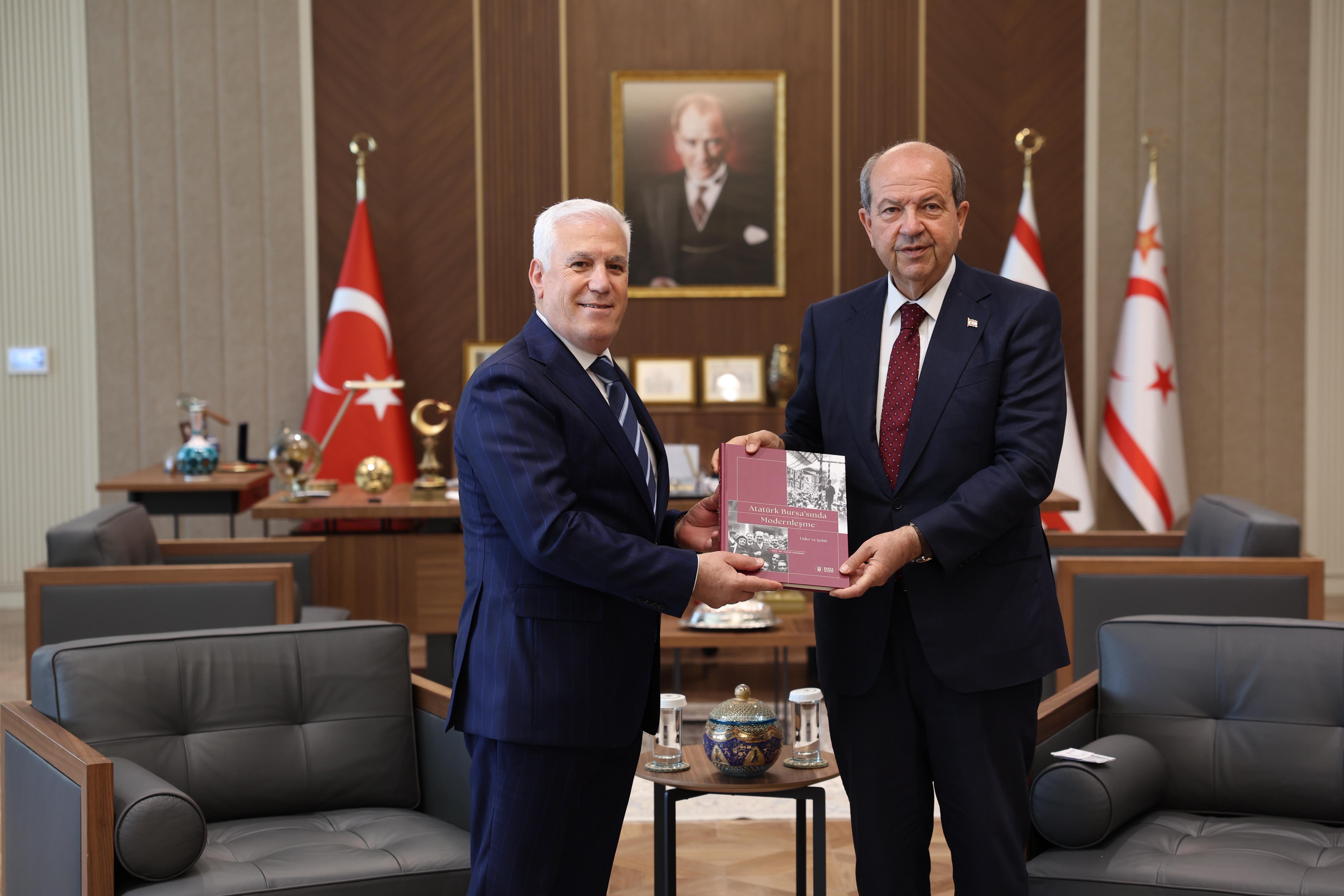 LEFKOŞA – Bursa Büyükşehir Belediye Başkanı Mustafa Bozbey, ‘Ekonomi, Yatırım ve Sinerji Zirvesi’ne katılmak üzere gittiği Kuzey Kıbrıs Türk Cumhuriyeti’nde (KKTC) Cumhurbaşkanı Ersin Tatar’ı makamında ziyaret etti. Kıbrıs Türklerinin menfaatlerini her zaman koruyacaklarını söyleyen Başkan Bozbey, KKTC ve Bursa arasındaki ikili ilişkilerin de güçlendirilmesi gerektiğini belirtti.