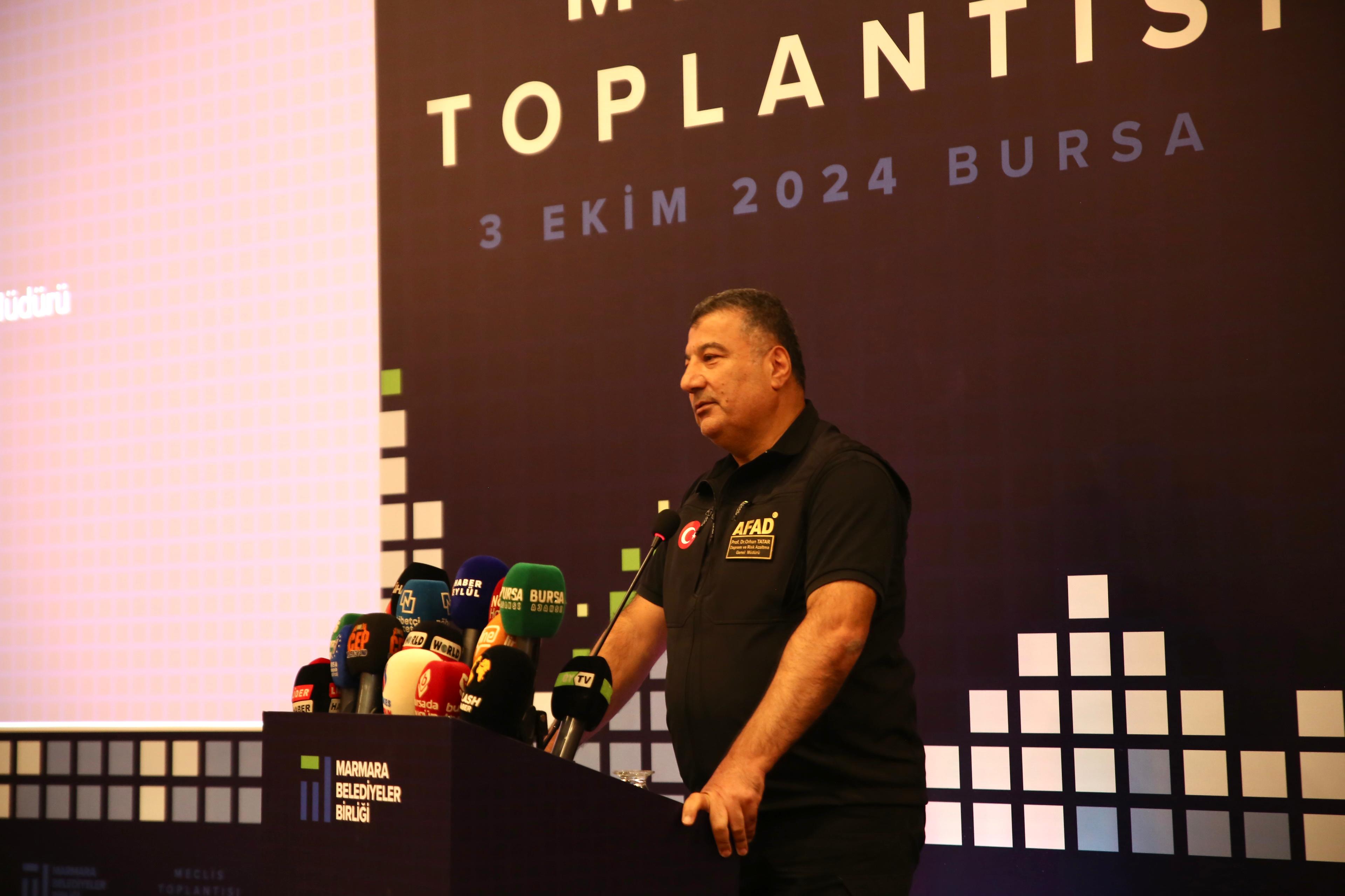 AFAD Deprem ve Risk Azaltma Genel Müdürü Prof. Dr. Orhan Tatar, Marmara Bölgesi’nin Türkiye’nin kalbi konumunda olduğunu hatırlattı. Yapılacak çok şeyin olduğunu ve birlik içinde hareket etmek gerektiğini anlatan Tatar, kendilerine düşen en önemli görevin de koordinasyonu sağlamak olduğunu söyledi. Marmara Bölgesi’nin sismoteknik özellikleri hakkında bilgi veren Tatar, “6 Şubat depremleri o ana kadar yapılan hiçbir hatayı affetmedi. 6 Şubat’tan büyük dersler çıkararak hızlı hareket etmeliyiz. Marmara’yı bekleyen büyük bir gerçek var. Marmara’da ve etrafından birçok aktif fay var. Topraklarında en fazla aktif diri fayı barındıran biziz. 485 tane tanımlanmış aktif diri fay var. 2025’in sonunda bitecek projenin ardından bu sayı 500’ü geçecektir. Bunların toplam uzunluğu 14 bin 500 kilometredir. Bunların her biri her an ülkemizin herhangi bir yerinde 5 ve üzeri büyüklükte bir deprem üretme potansiyeline sahip. Bunun bütün enerjimizi gücümüzü toplumsal farkındalığı artırıp riskleri azaltmaya ayırmalıyız” diye konuştu.