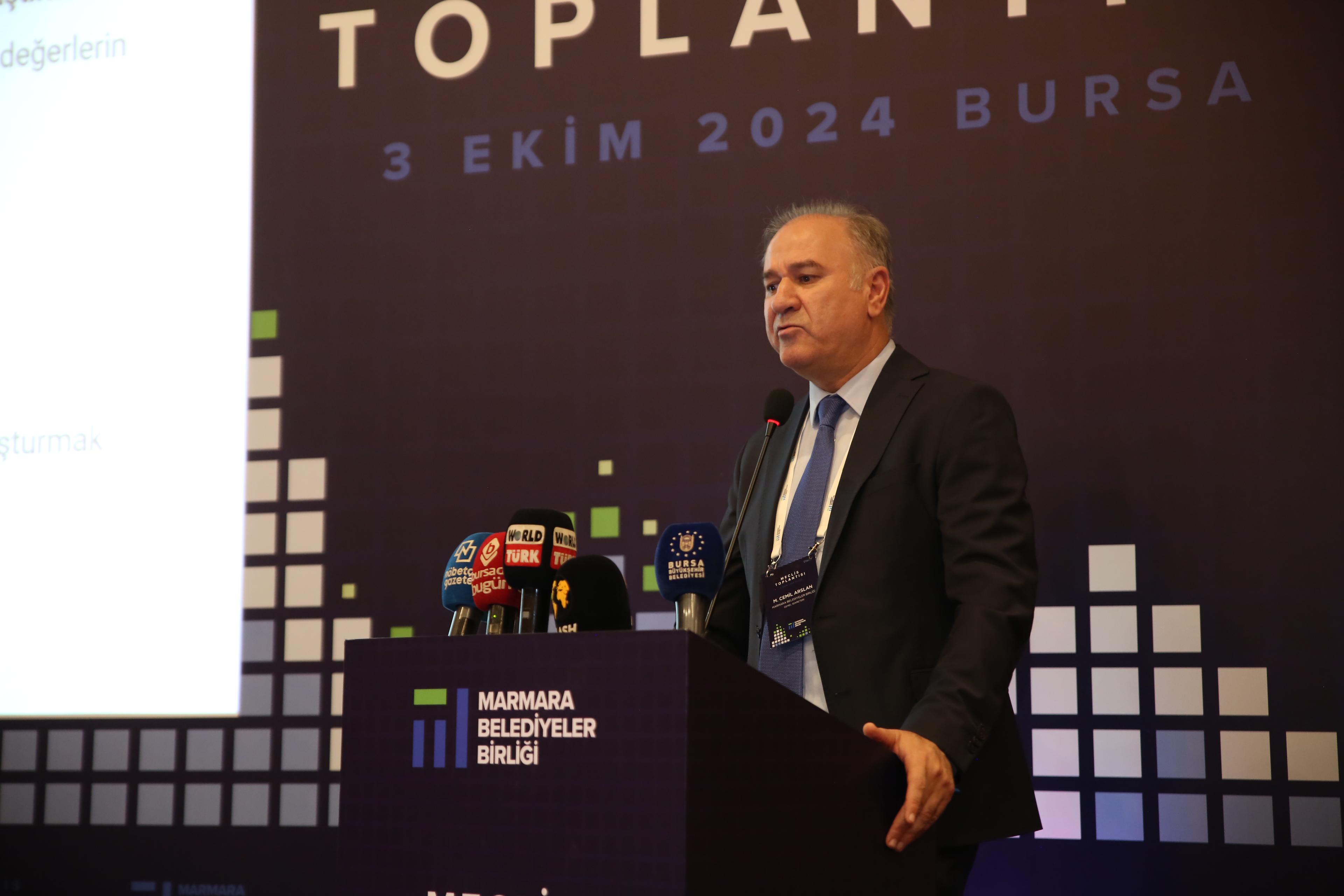 Birlik Meclisi’nin 2. Olağan Toplantısı’nın açılış konuşmasını yapan Marmara Belediyeler Birliği ve Bursa Büyükşehir Belediye Başkanı Mustafa Bozbey, Kahramanmaraş merkezli depremlerde ve yaşanan afetlerde hayatını kaybeden vatandaşları rahmetle anarak, yakınlarına ve milletimize sabırlar diledi. Doğal afetlerin, sosyal ve ekonomik yapılar üzerinde derin izler bıraktığını belirten Başkan Mustafa Bozbey, özellikle aktif fay hatları üzerinde yer almanın ve artan nüfus oranının ciddi riskleri de beraberinde getirdiğini dile getirdi. Yerel yönetimlerin kentleri afetlere karşı daha dayanıklı hale getirecek stratejik planlar geliştirme ve uygulama sorumluluğu bulunduğunu söyleyen Başkan Bozbey, “Kentlerimizi sadece bugünkü ihtiyaçlar doğrultusunda değil, yarının muhtemel risklerine karşı da hazırlıklı olacak şekilde planlamalıyız. Afet yönetimi, kriz anında uygulanacak sürecin çok ötesinde uzun soluklu ve kapsamlı bir stratejik konu olarak ele alınmalıdır. Depremin yanında iklim değişikliği, yangınlar, sel, heyelan ve Marmara Denizi’ndeki müsilaj benzeri afetler de dikkate almamız gereken tehditler arasında yer alıyor. Doğal afetlerin felakete dönüşmesini önlemek bizim elimizde. Erken uyarı sistemlerinin geliştirilmesi, risk analizlerinin düzenli yapılması, eğitim ve farkındalık çalışmalarının yaygınlaştırılması gibi temel adımlar, afet yönetiminin ayrılmaz parçalarıdır” diye konuştu.