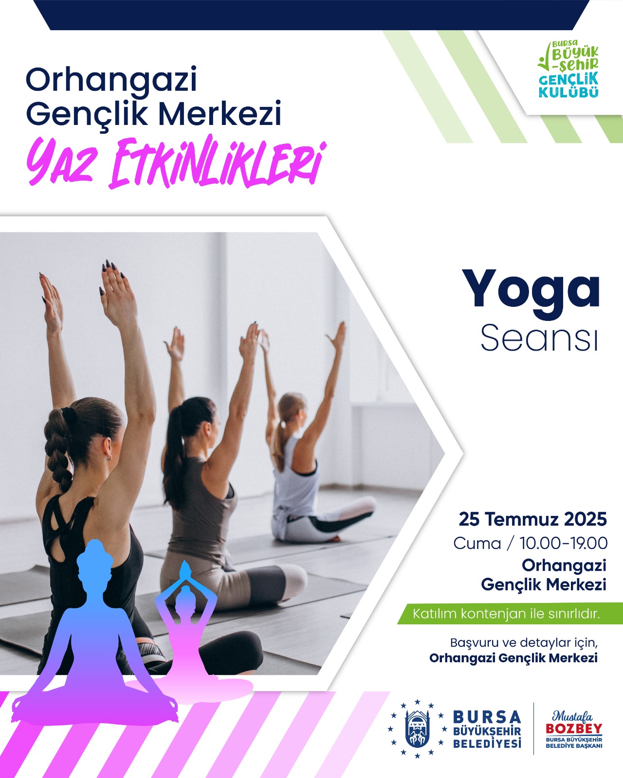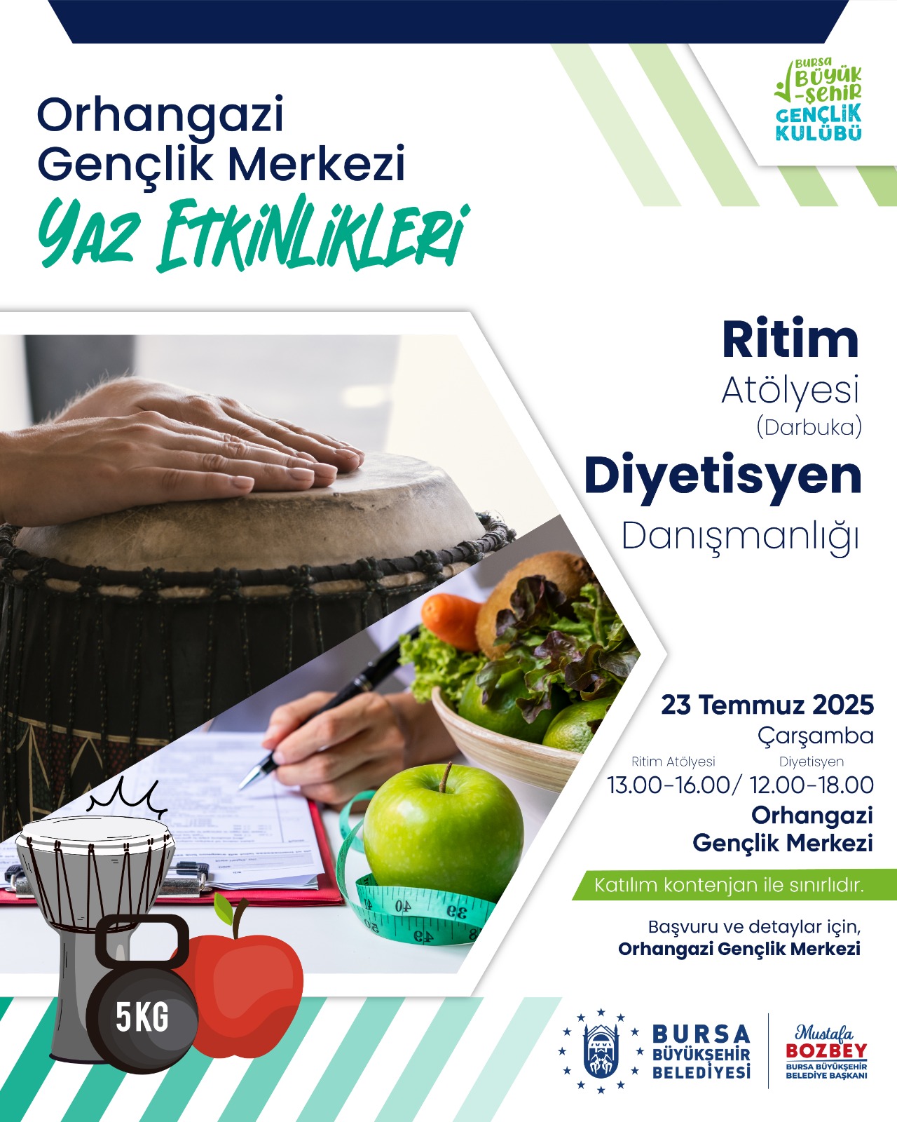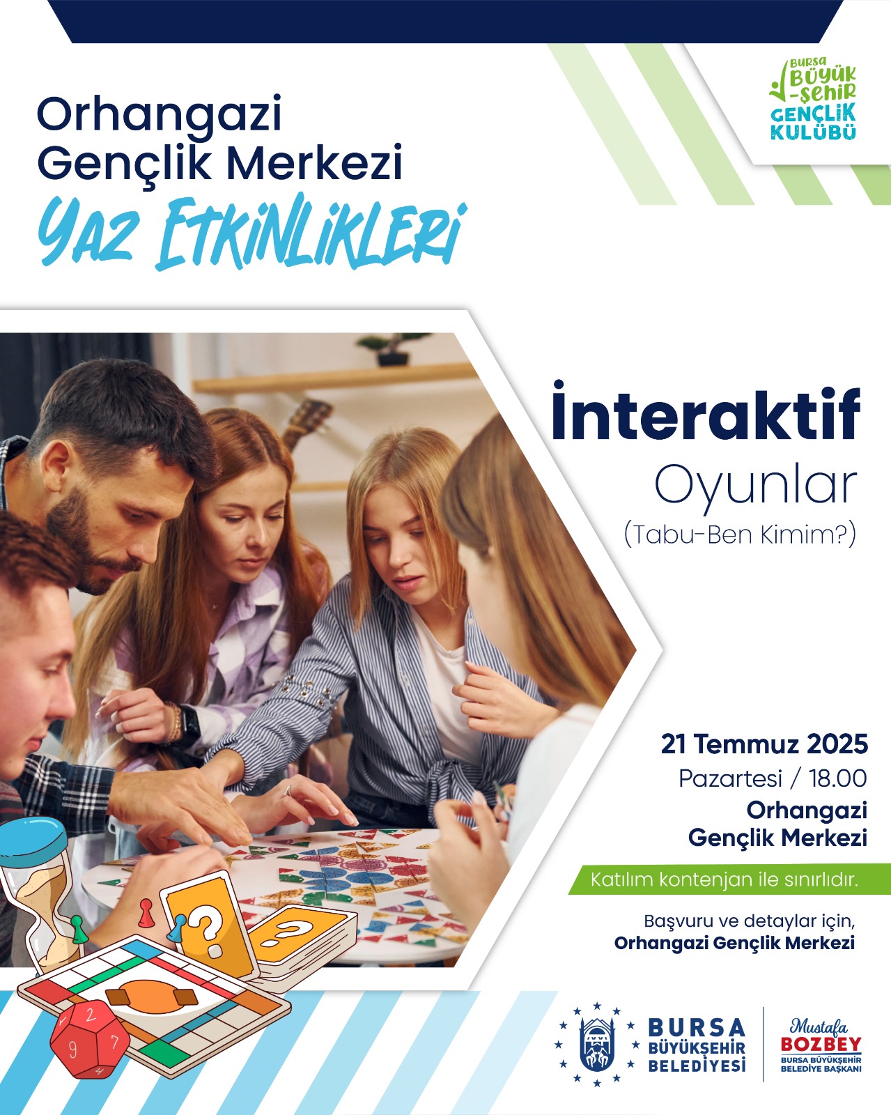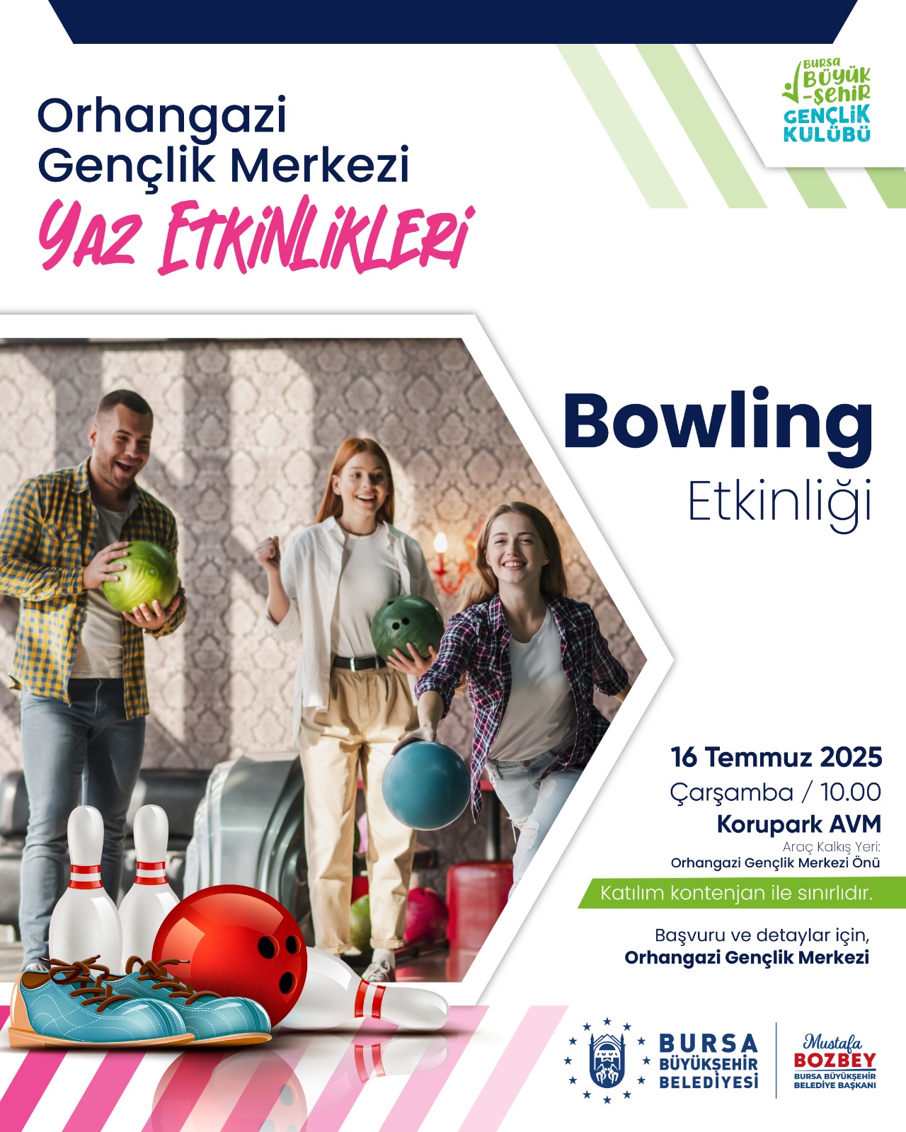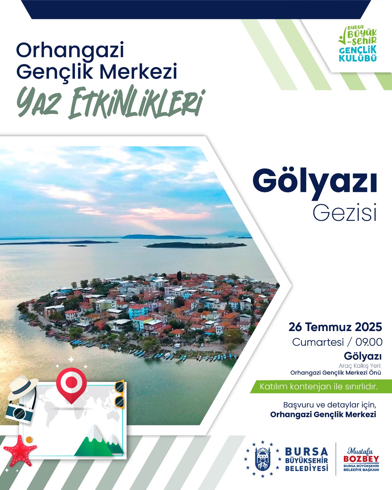 Bursa Büyükşehir Belediyesi, gençlerin yaz aylarını spor, atölye ve keşif gezileriyle dolu dolu geçirebilmesi için kapsamlı bir etkinlik programı hazırladı. Orhangazi Gençlik Merkezi ev sahipliğinde yapılacak olan etkinliklerle, Bursalı gençler yaz tatilini hem eğlenerek hem de öğrenecek geçirecek. Temmuz ayı boyunca düzenlenecek olan bowling ve sınav gecesi etkinliği, sinema gösterimi, dart turnuvası, Cumalıkızık ve Gölyazı gezisi, interaktif oyunlar, karaoke gecesi, ritim atölyesi, diyetisyen danışmanlığı, münazara gecesi, yoga seansı, e-spor turnuvası, go-kart ve wake up partiyle gençliğin kalbi Bursa’da atacak. Detaylı bilgi ve başvuru için Orhangazi Gençlik Merkezi ziyaret edilebilir veya bbgenclikkulubu sosyal medya hesapları takip edilebilir.