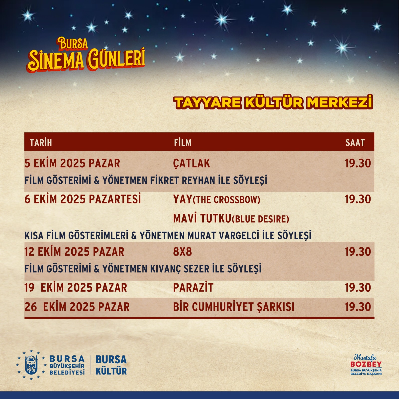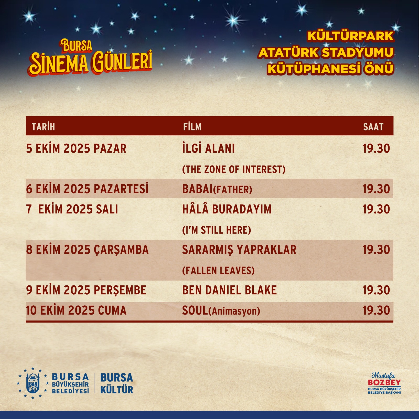 - BÜYÜKŞEHİR BELEDİYESİ’NİN HAZIRLADIĞI BURSA SİNEMA GÜNLERİ, 26 EYLÜL-30 EKİM TARİHLERİNDE BURSALILARA YILDIZLARIN ALTINDA SİNEMA KEYFİ YAŞATACAK