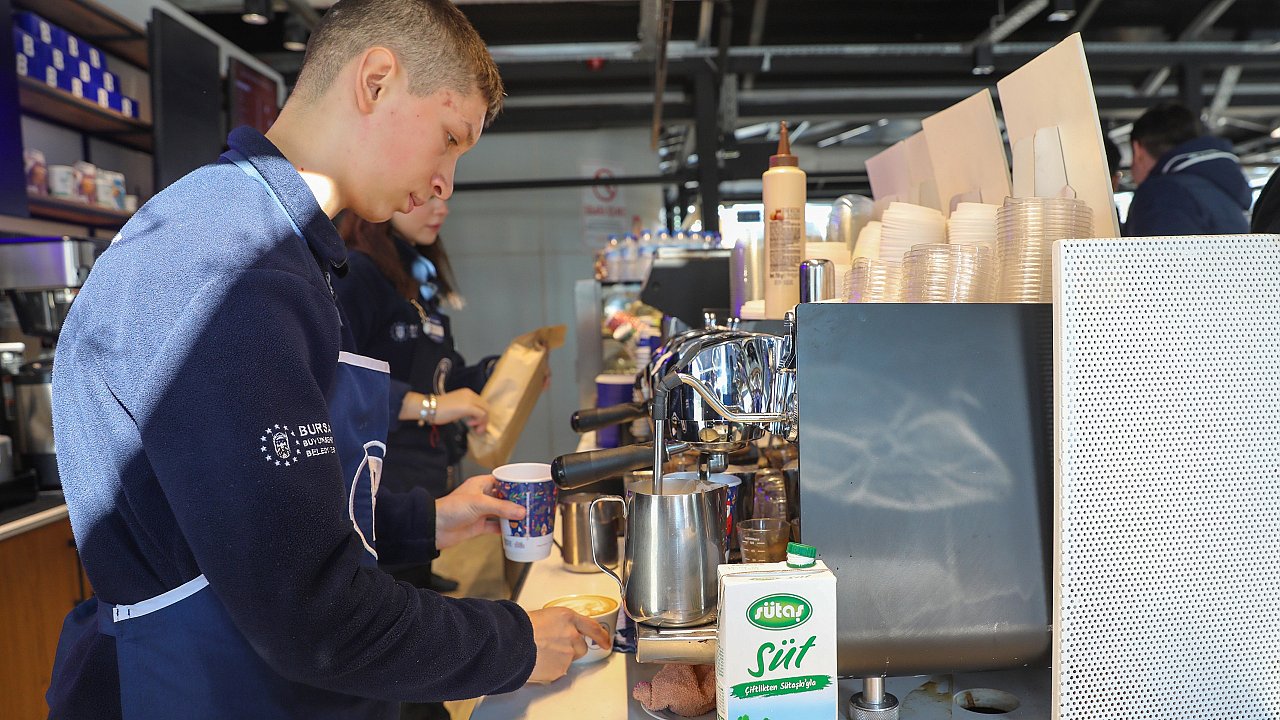 Merinos Parkı’ndaki BURFAŞ B Kafe’de stajyer barista olarak görev yapan 16 yaşındaki Ümit Hazar, barista önlüğünü giyerek personelle birlikte siparişleri titizlikle hazırlıyor. B Kafe’de staj yapmaktan mutluluk duyduğunu söyleyen Hazar, kafeye gelen vatandaşlardan da büyük takdir topluyor.