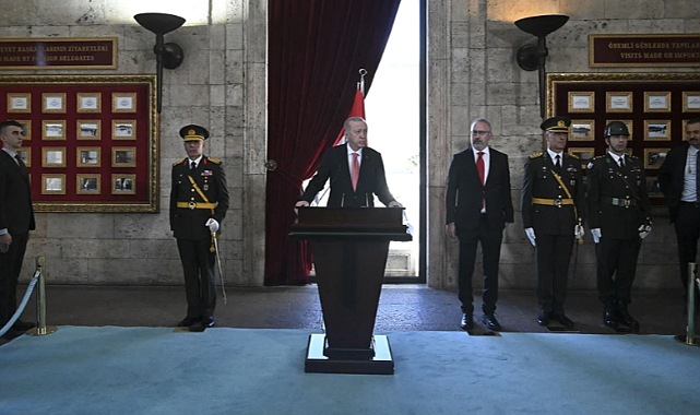Törenler için devlet erkanı da Cumhurbaşkanı Recep Tayyip Erdoğan öncülüğünde Anıtkabir'e çıktı.Mustafa Kemal Atatürk'ün ebedi istirahatgahında mozoleye çelenk koyan Erdoğan, burada saygı duruşu ve İstiklal Marşı'nın okunmasının ardından Misak-ı Milli Kulesi'ne geçti."HER TÜRLÜ TEDBİRİ ALIYORUZ"Cumhurbaşkanı burada Anıtkabir Özel Defteri'ni imzaladı.Erdoğan, deftere yazdığı "Aziz Atatürk, bugün bizlere emanetiniz olan milletimizin en büyük eseri aynı zamanda iftihar kaynağı olan Cumhuriyetimizin 101. yıl dönümüne ulaşmanın haklı sevincini yaşıyoruz. Bu gurur günümüzde, ülkemizde ve dünyanın dört bir yanında yaşayan tüm vatandaşlarımızın kalbi bizimle çarpan tüm soydaşlarımızın 29 Ekim Cumhuriyet Bayramını tebrik ediyorum.Bu vesile ile zatıalinizi, silah arkadaşlarınızı ve aziz şehitlerimizi bir kez daha şükranla yad ediyorum. Bölgemizde sınırların 1 asır evvel olduğu gibi yine kan ve gözyaşı ile çizilmek istendiği dönemde, vatanımızın bekasını, milletimizin güvenliğini korumak için her türlü tedbiri alıyoruz.