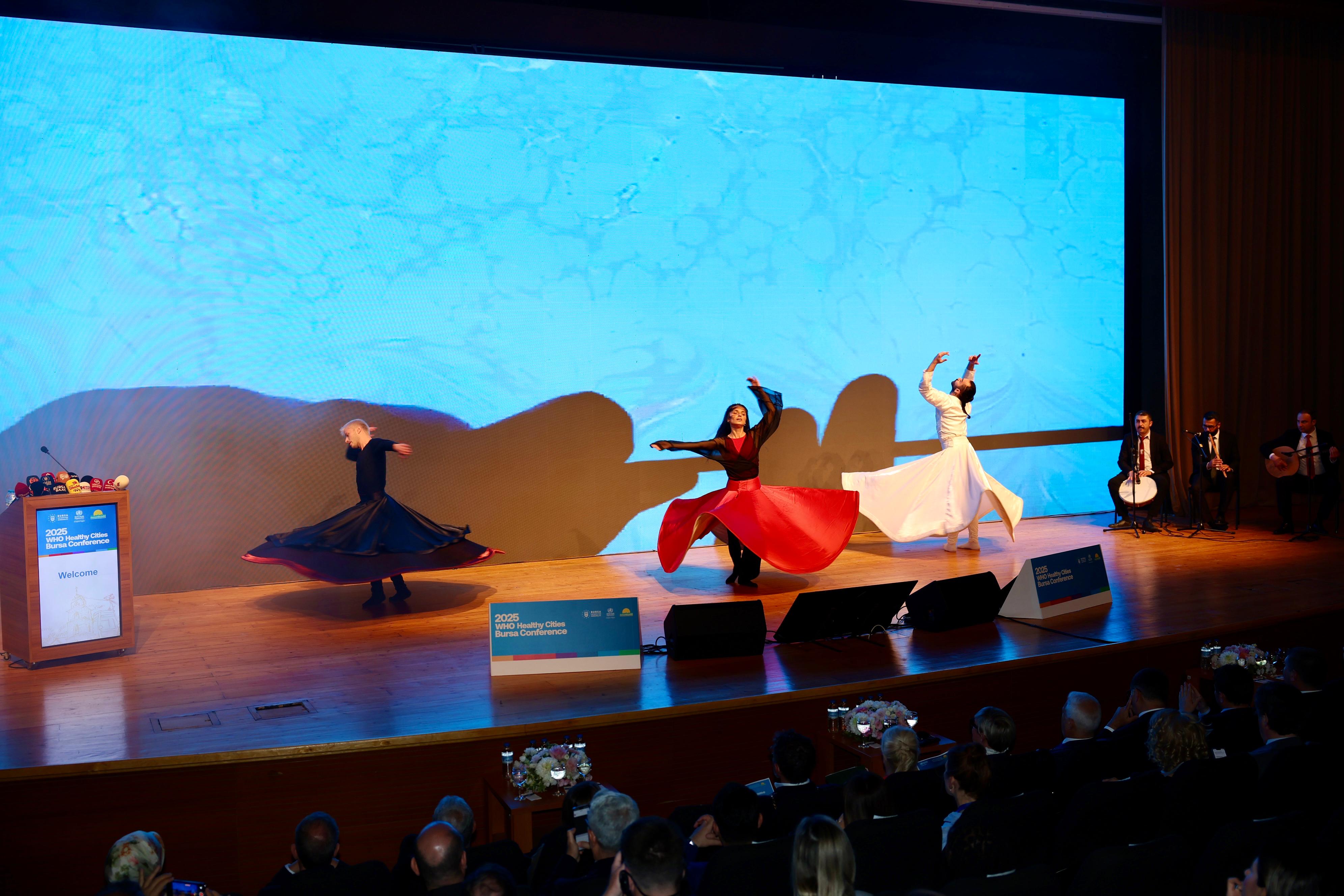 Bursa tanıtım filmi gösteriminin ardından sahnelenen Kılıç Kalkan ve sema gösterileri, izleyenlere görsel şölen yaşattı. DSÖ Avrupa Ofisi’nden Petra Hongell’in moderatörlüğünü üstlendiği programda konuşan Marmara Belediyeler Birliği ve Bursa Büyükşehir Belediye Başkanı Mustafa Bozbey, 2005 yılında yine Bursa’da bir araya geldiklerini ve Sağlıklı Kentler Hareketi’ne katkı sunduklarını hatırlattı. Aradan geçen 20 yılda dünyanın ve kentlerin değiştiğini, insanların sorumluluğunun ise daha da artığını söyleyen Başkan Bozbey, “Bugün, Sağlıklı Kentler Ağı’nın 7. fazından 8. fazına geçişine de hep birlikte tanıklık ediyoruz. 8. faza bugüne kadar kaydettiğimiz ilerlemeyi yansıtarak güçlü bir başlangıç yapacak ve sağlıklı bir gelecek için ortak bir yol haritası oluşturacağız. Bu yıl konferansımızın ana teması olan ‘Dirençli Sağlıklı Kentler: Herkes İçin Sürdürülebilir Kentsel Gelecekler’ başlığı altında ele alacağımız her konu, son derece hayati bir öneme sahip. İklim krizinden toplumsal eşitsizliklere, sağlık politikalarından refah ekonomisine kadar pek çok başlığı, alanında uzman konuşmacılarla birlikte değerlendireceğiz. ‘Herkes için sağlık’ ilkesini kentlerimizin planlamasına dâhil ederek, yerel yönetimlerin daha kapsayıcı ve sürdürülebilir politikalar üretmesine katkı sunacağız” diye konuştu.