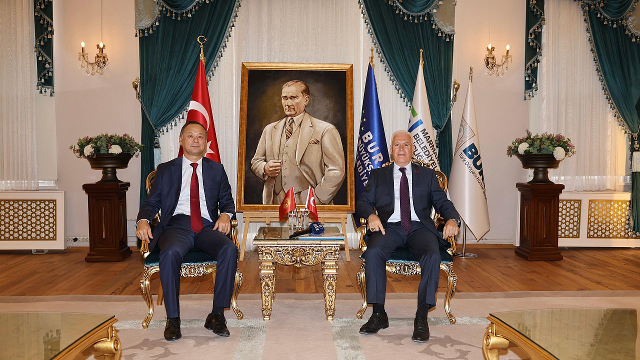 KIRGIZİSTAN İLE KARDEŞLİK KÖPRÜSÜBURSA -Kırgız Cumhuriyeti Ankara Büyükelçisi Ruslan Kazakbaev’in Başkan Mustafa Bozbey’e yaptığı ziyarette, Bursa Büyükşehir Belediyesi ve Kırgız Cumhuriyeti belediyeleri arasında hayata geçirilebilecek ortak projeler ve iş birlikleri değerlendirildi.Kırgız Cumhuriyeti Ankara Büyükelçisi Ruslan Kazakbaev ve beraberindeki ekip Bursa Büyükşehir Belediye Başkanı Mustafa Bozbey’i Tarihi Belediye Binası’nda ziyaret etti. Ziyarette, Türkiye ile Kırgızistan arasındaki dostane ilişkiler, kardeşlik bağları, belediyeler arasında hayata geçirilebilecek ortak projeler ve iş birliğinin geliştirilmesine yönelik konular ele alındı.Başkan Bozbey, Bursa’nın köklü tarihi, kültürel zenginlikleri ve güçlü sanayi altyapısıyla Kırgızistan ile her alanda ortak projelere açık olduğunu söyledi. İki ülke halkları arasındaki kardeşlik ilişkilerinin daha da güçlenmesi gerektiğine dikkat çeken Başkan Bozbey, Bursa’nın özellikle kültür, eğitim, turizm ve ticaret alanlarında iş birliği fırsatları sunduğunu belirtti.Büyükelçi Kazakbaev de misafirperverliğinden dolayı Başkan Bozbey’e teşekkür ederek, Bursa’nın, Türkiye’nin en büyük dördüncü kenti rolüyle Kırgız Cumhuriyeti için büyük bir değer taşıdığını söyledi. Kazakbaev, iki ülke arasındaki tarihi ve kültürel bağların daha fazla ortak çalışma ile pekiştirilebileceğini dile getirdi.Ziyaret, karşılıklı hediye takdimi ve günün anısına çekilen hatıra fotoğrafının ardından sona erdi.