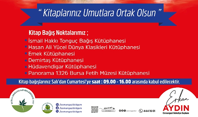 Kütüphanesi, Demirtaş Kültür Merkezi Kütüphanesi, Hüdavendigar Kütüphanesi ve İsmail Hakkı Tonguç Bağış ve Şiir Kütüphanesi’ne kitaplarını teslim edebilirler.Osmangazi Belediye Başkanı Erkan Aydın, ‘Kitaplarınız Umutlara Ortak Olsun’ kampanyası ile Osmangazi’nin kütüphanelerindeki 41 bin 922 olan kitap sayısını yükseltmek istediklerini ifade etti. Başkan Aydın, “İlçemize yeni kütüphaneler kazandırmanın yanı sıra kütüphanelerimizdeki kitap sayılarımızı da artırıyoruz. Zengin yayın koleksiyonuna sahip kütüphanelerimizde süreli yayınlardan romanlara kadar pek çok kitap bulunuyor. Ayrıca bu merkezlerimizde bulunan oturma salonları, ders çalışma alanları, grup çalışma odaları, çocuk ve genç bölümleri, öğrenciler için ders çalışmayı oldukça keyifli bir hale dönüştürüyor. İsmail Hakkı Tonguç Bağış ve Şiir Kütüphanesi için başlattığımız kampanyamızla sizlerle birlikte büyümeyi hedefliyoruz. Raflarınızda beklettiğiniz kitaplarınızı yılın her döneminde kütüphanelerimize bağışlayabilirsiniz” dedi.
