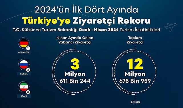 turizm Bakanlığı verilerine göre, bu dönemde Türkiye toplamda 12 milyon 678 bin 959 ziyaretçi ağırladı. Kültür ve Turizm Bakanlığı'nın sosyal medya hesabından paylaşılan verilere göre, 2024'ün ilk dört ayında geçen yılın aynı dönemine göre yabancı ziyaretçi sayısında yüzde